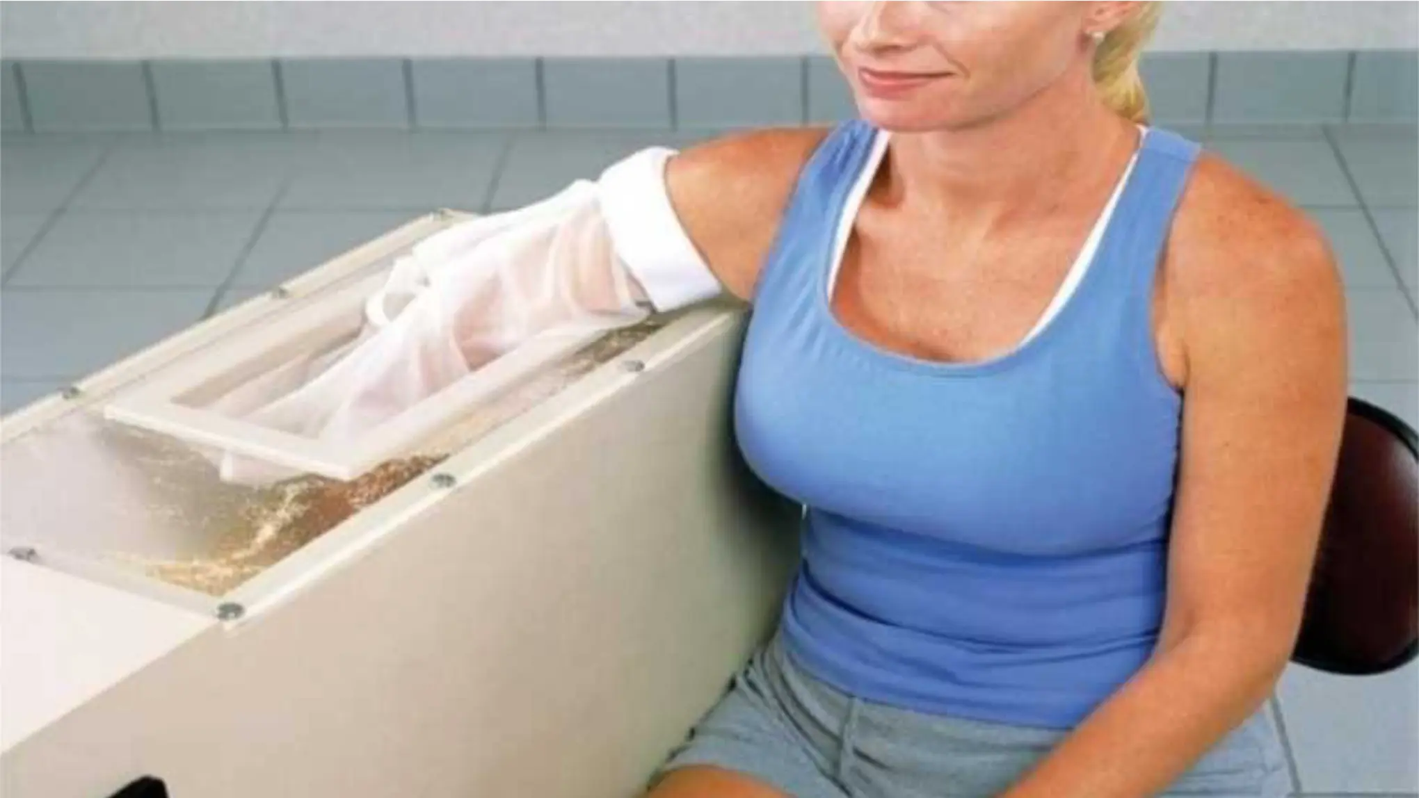 Fluidotherapy is a high intensity heat modality that uses medical cellulose instead of water as the conductive medium. The high heat allows the treatment to be administered in a completely sterile environment, and active exercise can be performed while the treatment is being administered allowing for maximal improvement in range of motion and reduction in pain.